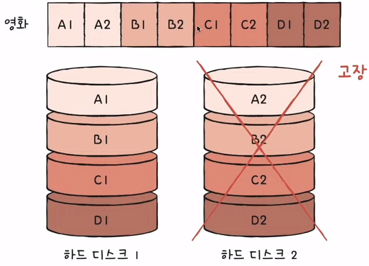 단점 : 저장된 정보가 안전하지 않음 - 하나가 고장나면 데이터가 망가짐