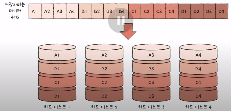 저장되는 데이터가 하드 디스크 개수만큼 나뉘어 저장
