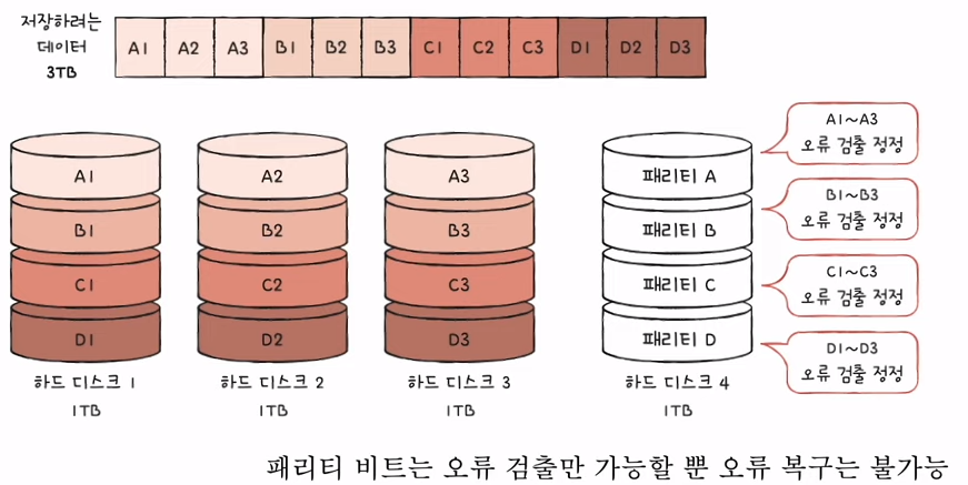 패리티 비트를 저장한 장치를 이용해 다른 장치들의 요류를 검출하고 오류가 있다면 복구