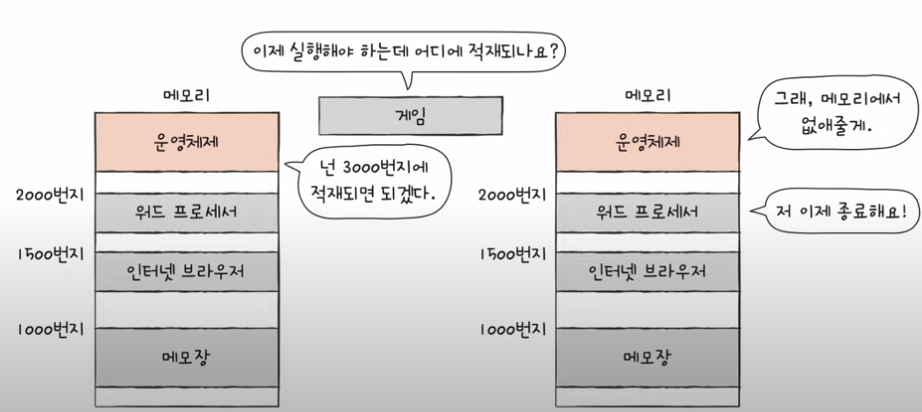 그림과 같이 응용프로그램들을 적당한 메모리 주소가 겹치지 않도록 적재해주면서 삭제하고 지속적으로 메모리 자원을 관리하는 역활을 함