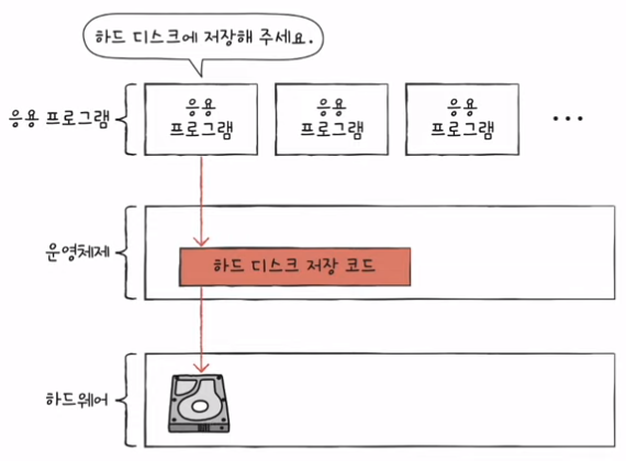 운영체제가 제공하는 기능으로 인해서 개발자는 하드웨어를 조작하는 코드를 직접 작성할 필요가 없어짐