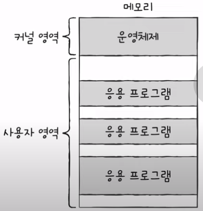 운영체제는 특별한 프로그램이기에 컴퓨터 부팅시 매모리내에 커널 영역이라 하는 공간에 따로 적재됨