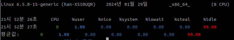 %iowait : 다른 통신으로 인해 CPU의 작업이 일시적으로 대기하는데 소비된 CPU 시간 (입출력장치,보조기억장치 등등)