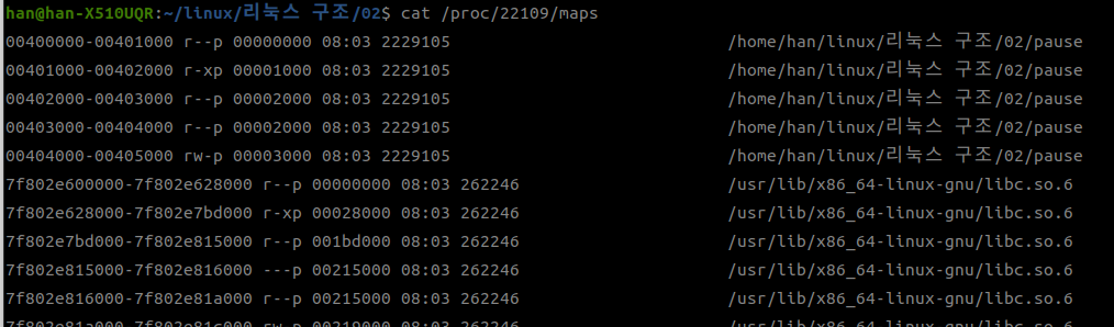 /proc/PID번호/maps 파일을 통해 프로세스의 메모리 맵을 볼 수 있다.