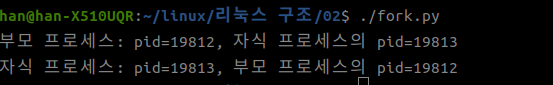 print("부모 프로세스: pid={}, 자식 프로세스의 pid={}".format(os.getpid(), ret))