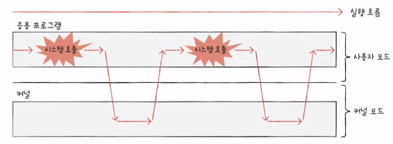 프로세스는 사용자 모드로 실행되지만 커널에 처리를 요청하면 예외처리가 발생하며 CPU모드가 커널모드로 바뀌고 동작합니다. 그리고 시스템콜 처리가 끝나면 다시 사용자 모드로 돌아와 프로세스 동작을 이어감
