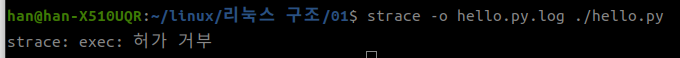 앗 허가가 거부되는군요 이럴땐 chmod +x hello.py로 권한을 부여합시다.