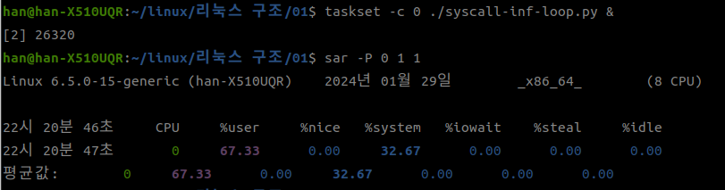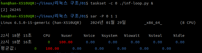 taskset -c 0 ./inf-loop.py & : 논리 cpu 0 에서 무한루프 실행