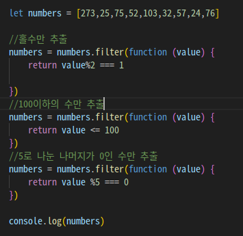 3. 5로 나눈 나머지가 0인 수만 추출 --> 그대로 %5 === 0 일때 숫자만 true로 전달