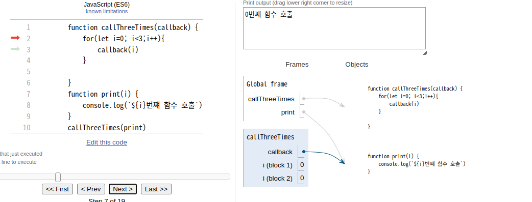 2번 : for 문으로 반복되며 내부 함수 callback(0)을 호출합니다. ==> print(0) 호출