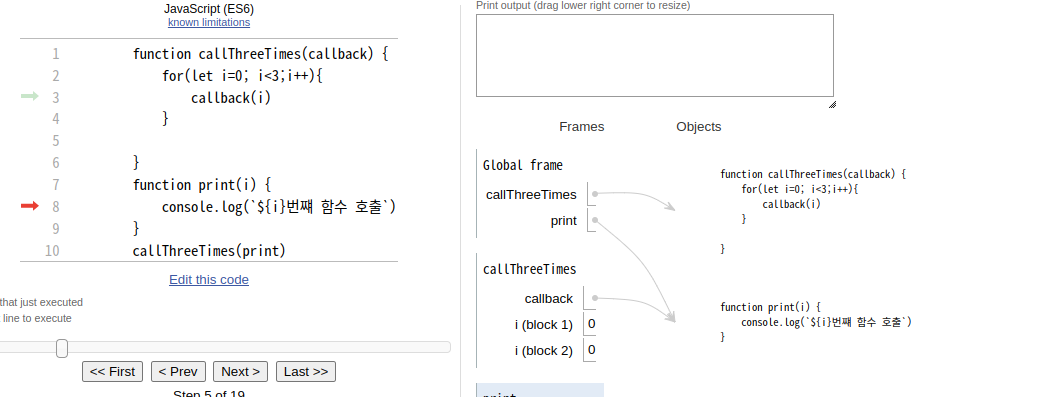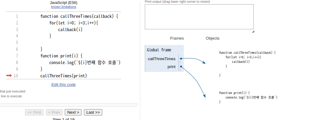 참고: callTreeTimes(print)의 매개 변수로 넘어와서 callback == print입니다.