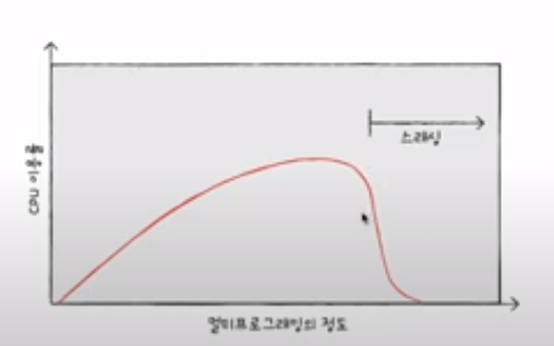 동시 실행되는 프로세스가 늘린다고 CPU 이용률도 계속 비례해서 높아지는 것이 아니다.
