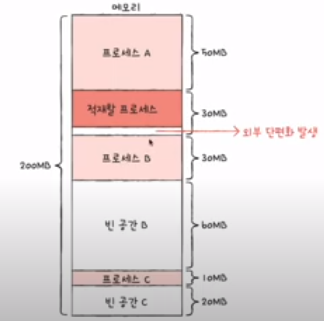 프로세스들이 실행되고 종료되길 반복하면서 메모리 사이에 생기는 작은 공간으로 인해서 생기는 메모리 낭비 현상.