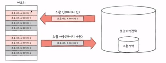 스왑 인 : 스왑 영역에 있던 프로세스가 다시 메모리로 옮겨오는 것