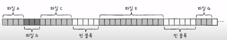 단점 : 파일을 연속적으로 할당하기 때문에 파일이 삭제된 후 빈 블록들의 크기가 충분히 크지 않을 경우가 생겨 외부 단편화를 발생시키는 단점이 있다