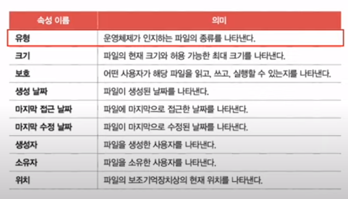 구성요소 : 파일을 이루는 정보, 실행하기위한 정보, 부가정보 (=속성, 메타데이터)